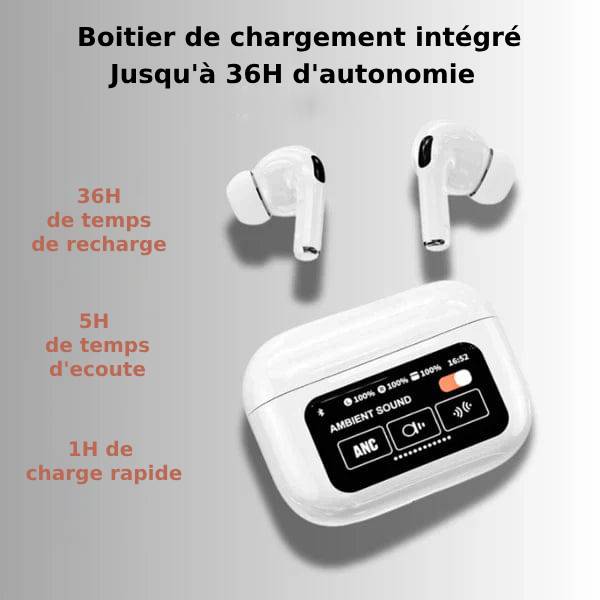 Des écouteurs qui se glissent facilement dans votre sac à main. L’étui chic avec écran LED ajoute une touche de sophistication à votre style.